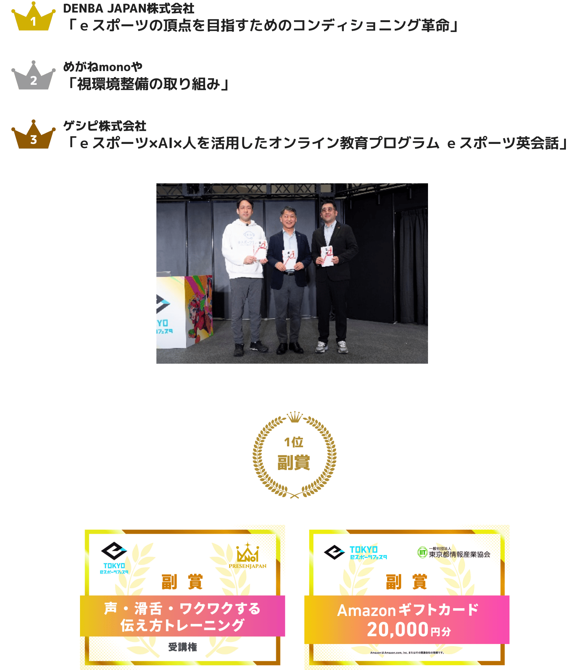 関連産業展示会の出展事業者が、eスポーツ関連産業の活性化に向けた新規サービスや製品などに関するアイデアのプレゼンテーションを会場内ステージにて行います。